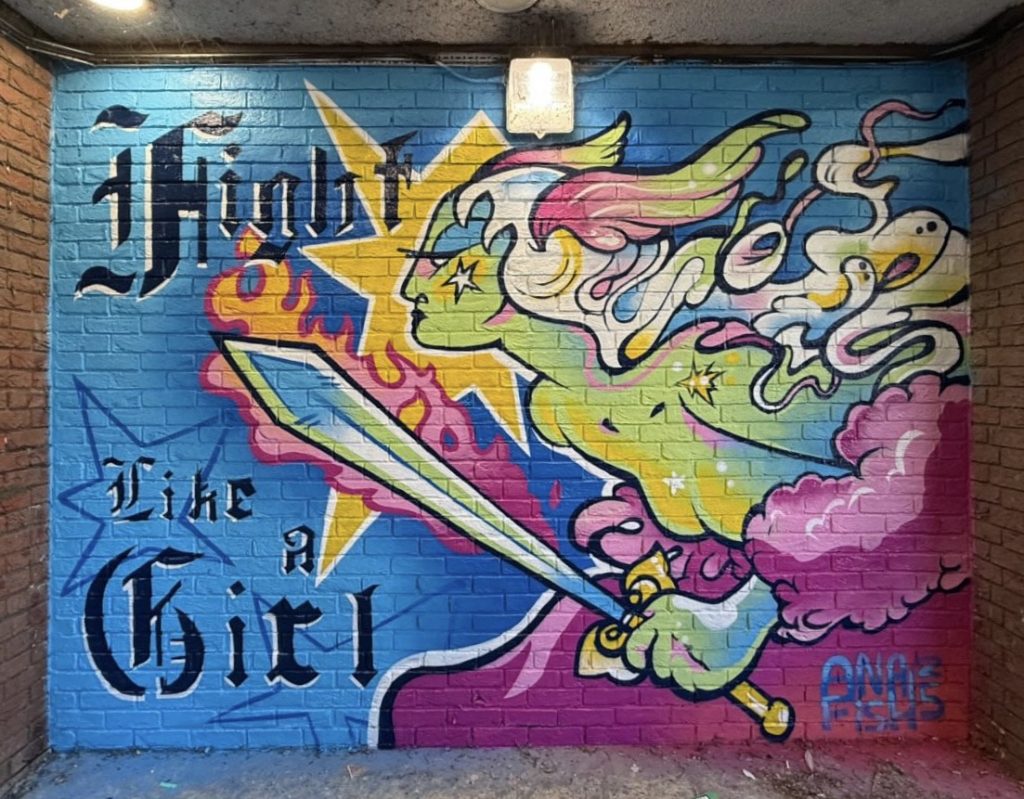 Her response was a Valkyrie – a figure drawn from mythology, powerful and watchful – accompanied by the words “Fight Like a Girl.” The phrase is confrontational, reclaiming a term often used dismissively and turning it into a statement of pride and resistance.