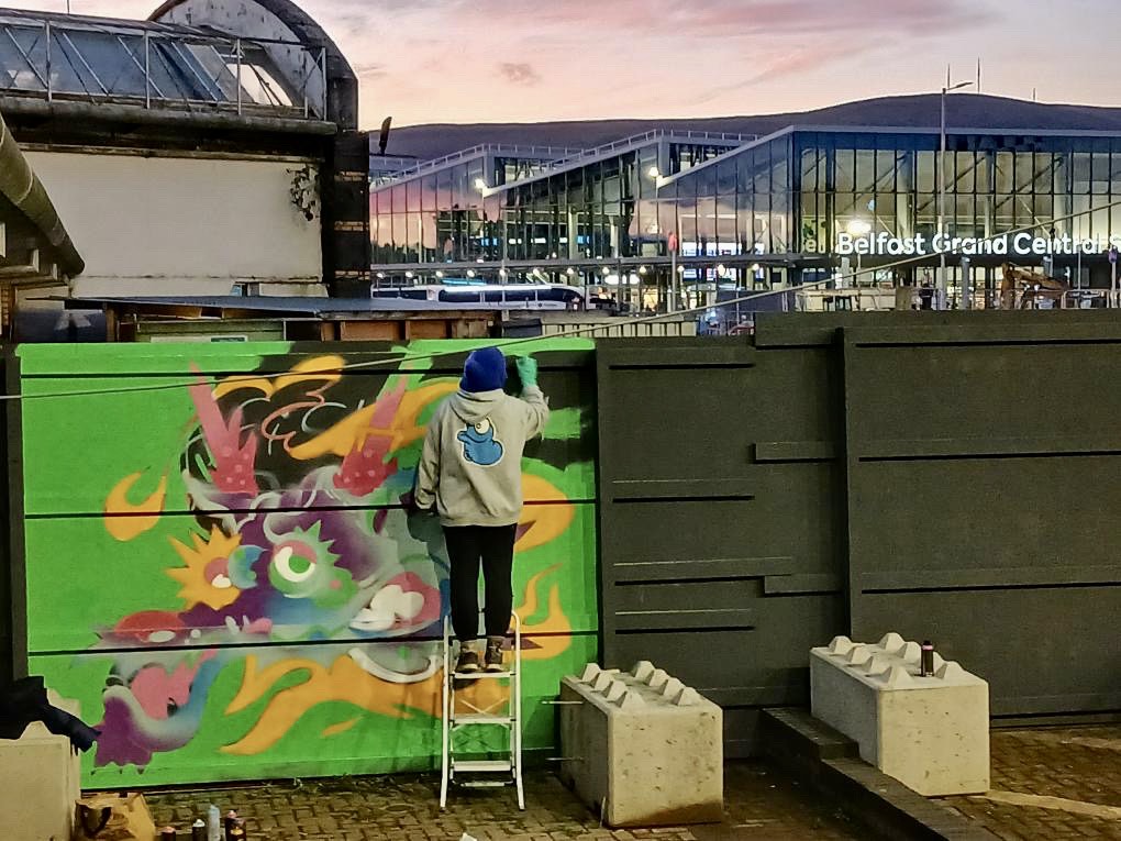 She speaks about the joy of welcoming visiting artists, introducing them to Belfast, and watching them connect with the place. For her, Hit the North has one of the strongest social dynamics of any festival she has attended – artists meeting artists, conversations extending long after the paint dries.