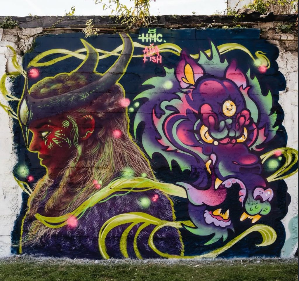 That sense of shared experience was equally present when Ana travelled to Waterford with her friend Constance for Waterford Walls. Together, they painted Freya and Loki – two figures from Norse mythology brought into conversation on the wall.