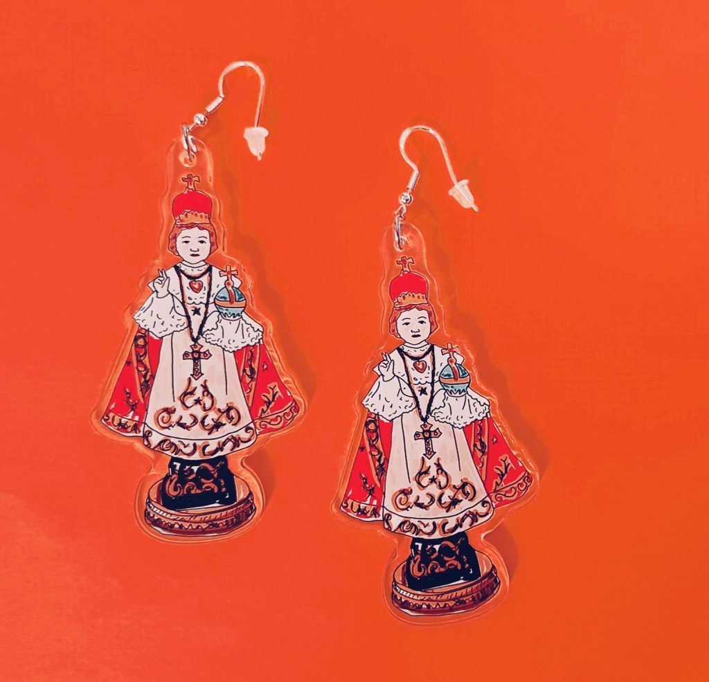Another example of cultural memory made contemporary is her Child of Prague design – originally an illustration inspired by the statue that lived in her childhood home, once repaired with a makeshift bottle lid after being knocked over.