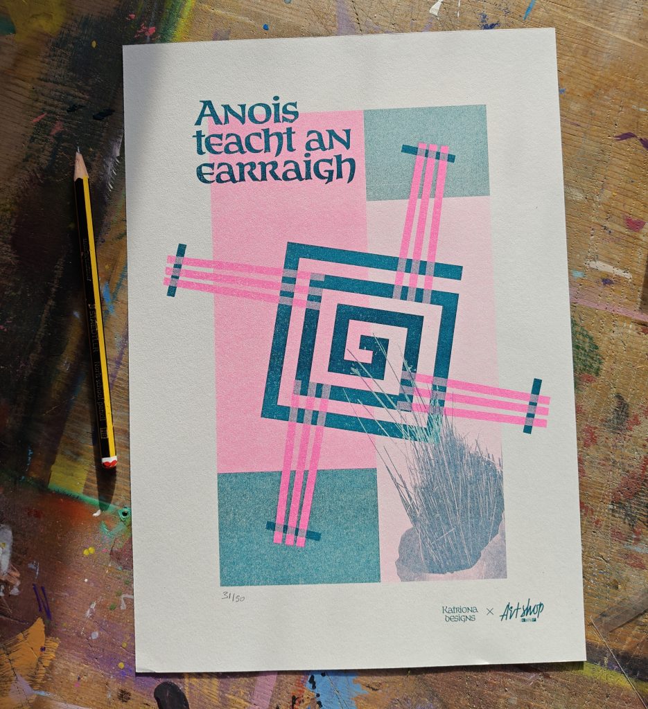 That lineage filtered into a collaborative risograph print created with Belfast School of Art – a two-colour piece designed around the overlapping plates that create a third hue where they meet. In Anois Teacht An Earriagh rush patterns, collage, spring colour and instinctive composition sit side by side.