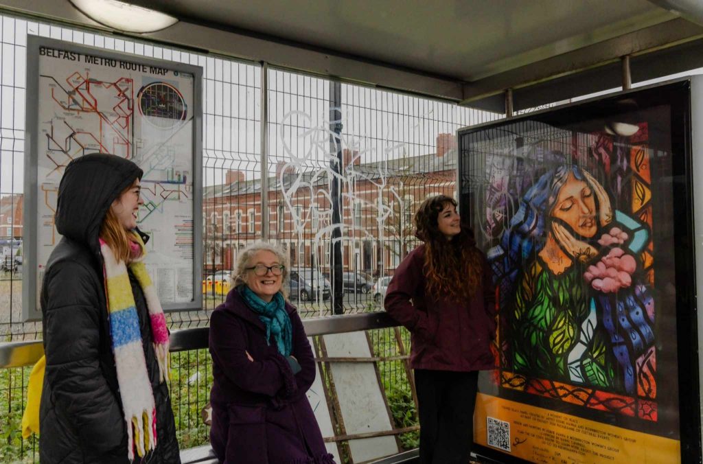 The exhibition addressed the demonisation of healer women and the ongoing realities of violence against women, including trans women, situating myth within lived urgency. Hanna exhibited her Inner Landscape paintings there for the first time, alongside a stained glass panel co-designed with Mornington Women’s Group exploring Belfast’s evolving story post-ceasefire.